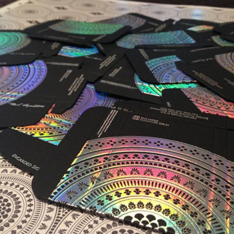 Crafted by Paul Carpenter, the Zenith is the first playing card deck of the Encarded Signature Series. It features a dramatic re-imagination of classic playing card deck themes such as a central circular medallion motif, black and white theme, and borderless presentation. The box is also unique as it opens sideways and the box itself is created with a thick matte black paper. The Zenith playing card is beautifully crafted with intricately detailed holographic silver foil. Under the cellophane is the seal with a sequenced number (xxxx/1000).