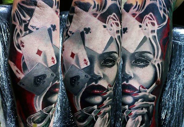 If you are all about vibrant colours and the constant rework it needs over time, then this tattoo is clearly for you. Just look at all the bold colours of the joker, the cards, the billiard ball, and the flower, and you’ll immediately appreciate all the hard work that came with this tattoo. It managed to subtly infuse gambling without going over the top.