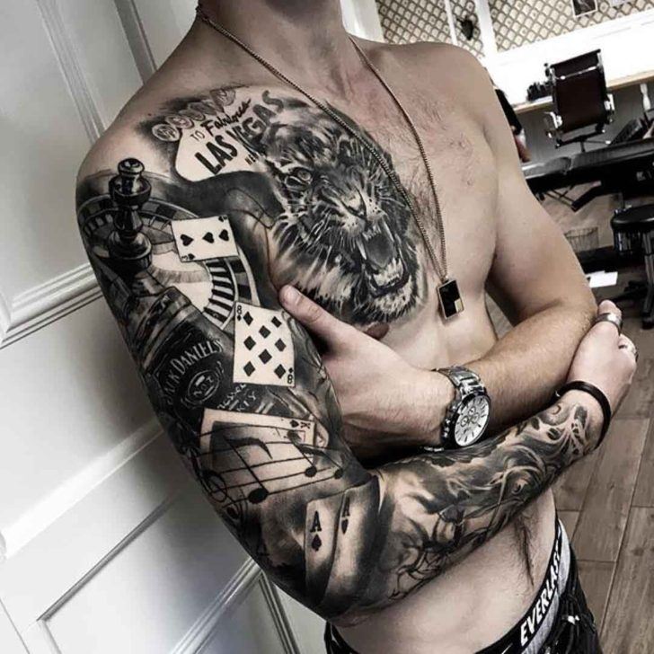 With the classic “Welcome to Las Vegas” also present in this design, it is clear how many tattoo artists and enthusiasts still consider Sin City as the ultimate gambling paradise. Roulette wheel, the booze, the musical notes, and the cards all say that this guy really knows how to have a good time. Of course, who can miss that astonishing tiger that seems to provoke you to make a bet against his master?
