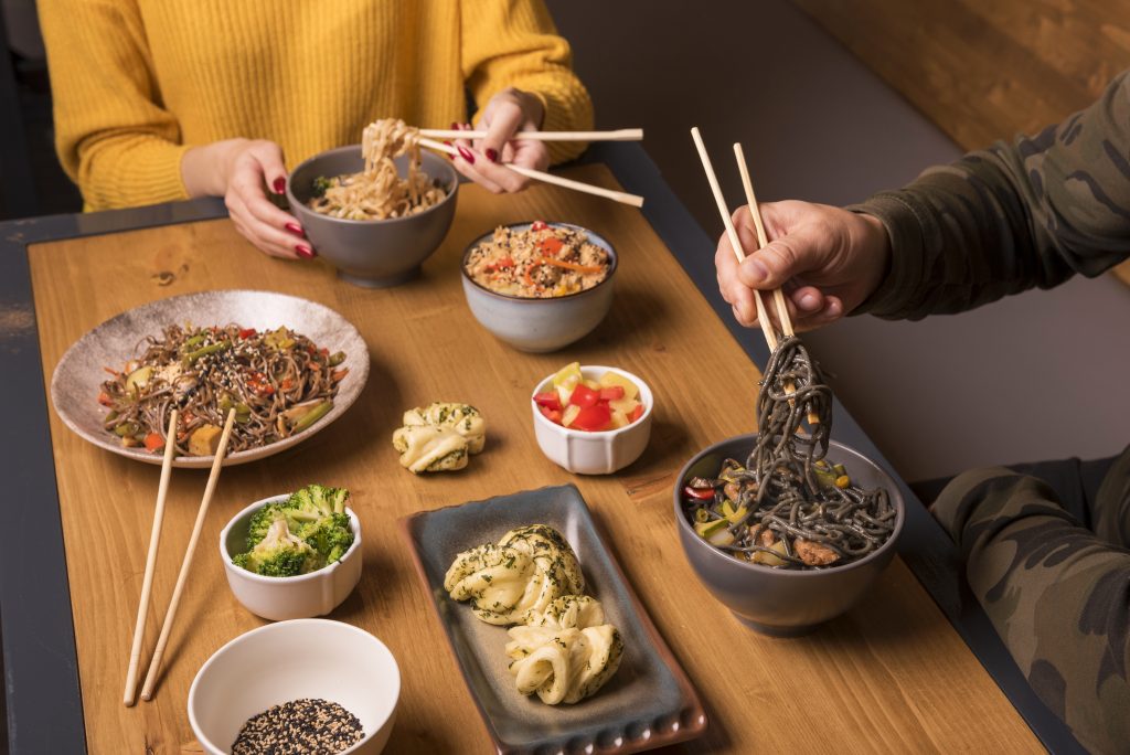 Most meals are served in a communal style. Sharing is normal, and dishes rotate on a lazy Susan.